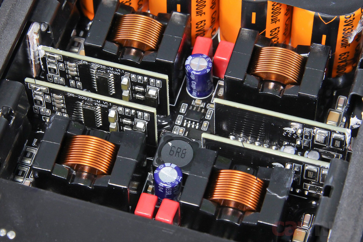 Компоновка остальной части достаточно плотная, драйвера D-класса пришлось даже вывести на отдельные вертикальные субплаты – они построены на хорошо зарекомендовавших себя «ирисках» IRS2092. Выходные фильтры построены на немного непривычных дросселях, рассчитанных на более серьёзные токи, чем те, что обычно применяются в подобных усилителях. Ну и конденсаторы WIMA тоже весьма к месту.