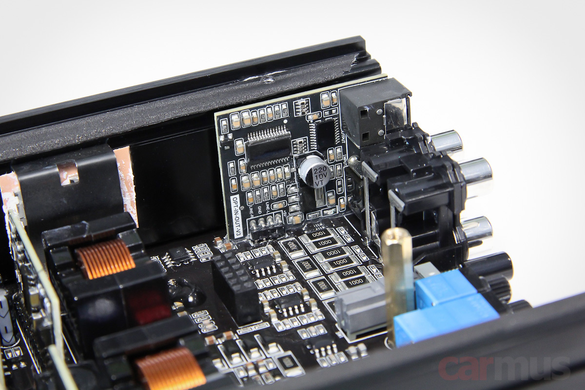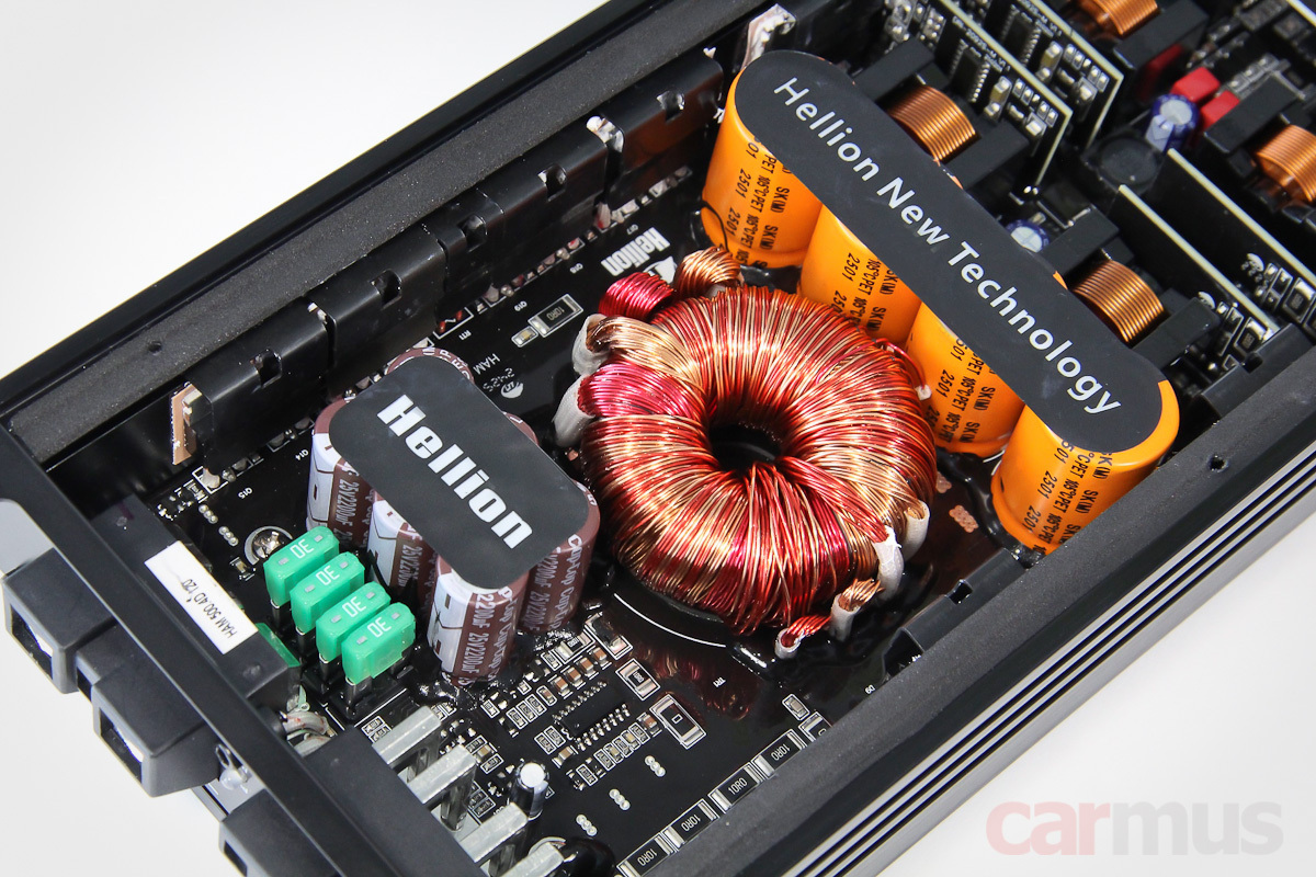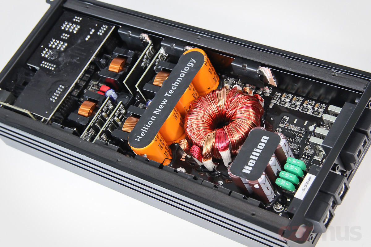 Теперь немного начинки. При немалых заявленных мощностях вполне логично, что львиная доля внутреннего пространства отведена под блок питания. Он здесь многое перенял от Hellion HAM 450.4D – с дополнительной стабилизацией питания драйверной части, но с обычным питанием силовых ключевых каскадов. Этим удалось сохранить высокий КПД, но обеспечить нормальную работу при значительных просадках напряжения (актуально для автомобилей с системой Start/Stop).