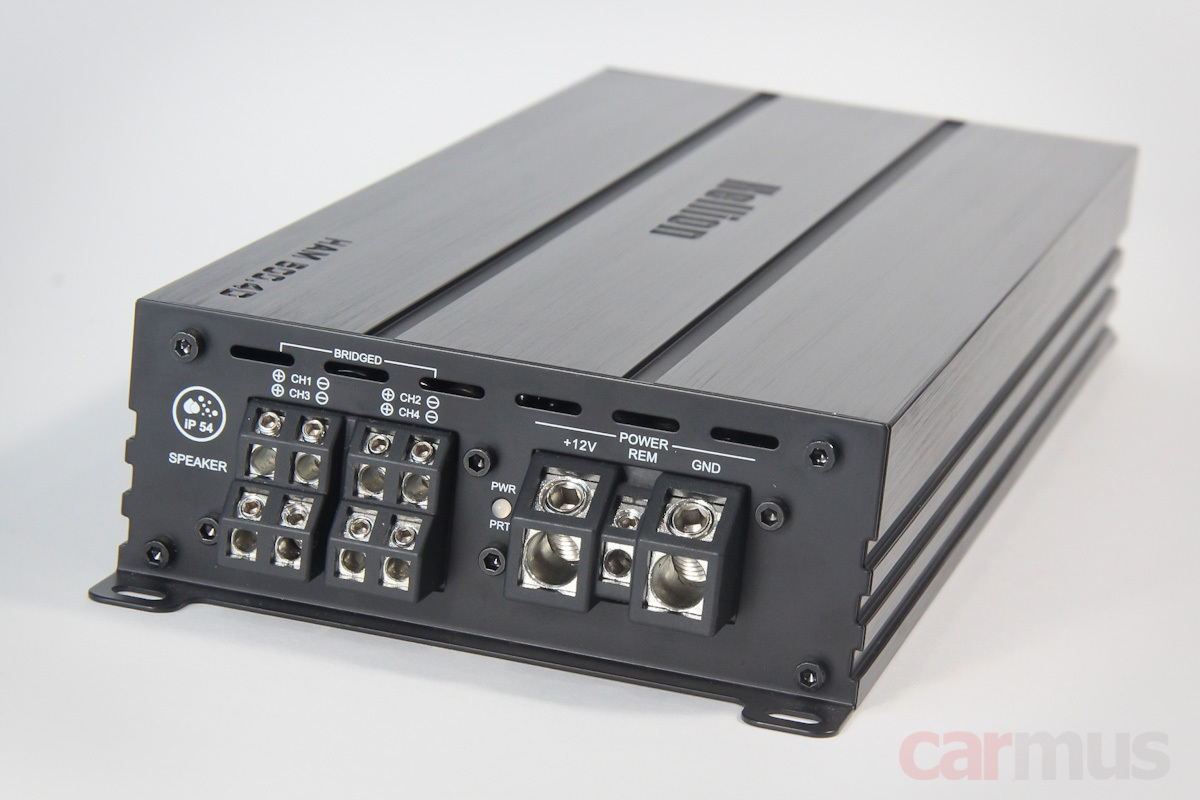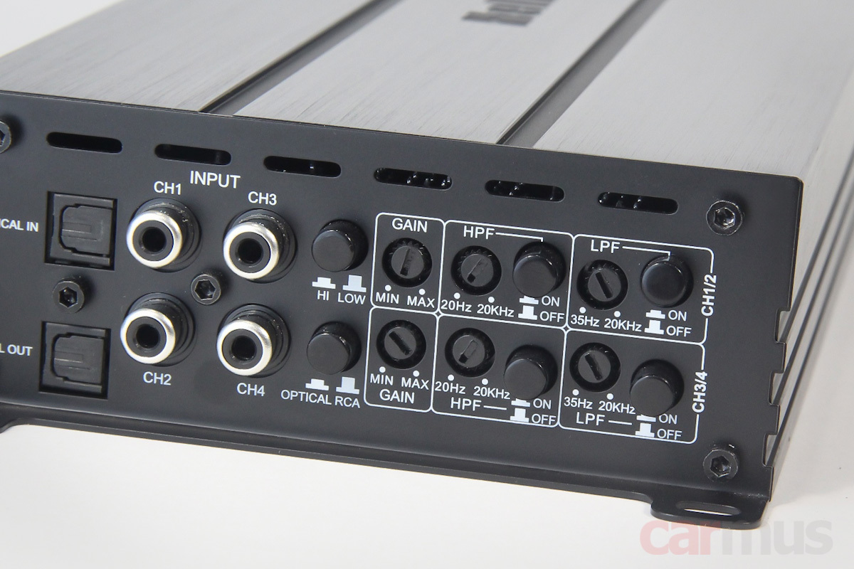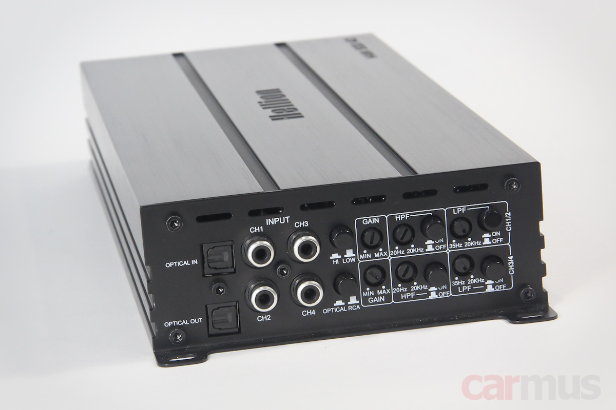 Усилители всей «оптической» линейки выполнены в корпусах с одинаковым профилем и различаются лишь длиной. Из них самый длинный – это как раз 4-канальник, но даже он примерно сопоставим с листом офисной бумаги А4, сложенным вдоль пополам. Для заявленной мощности получилось весьма компактно